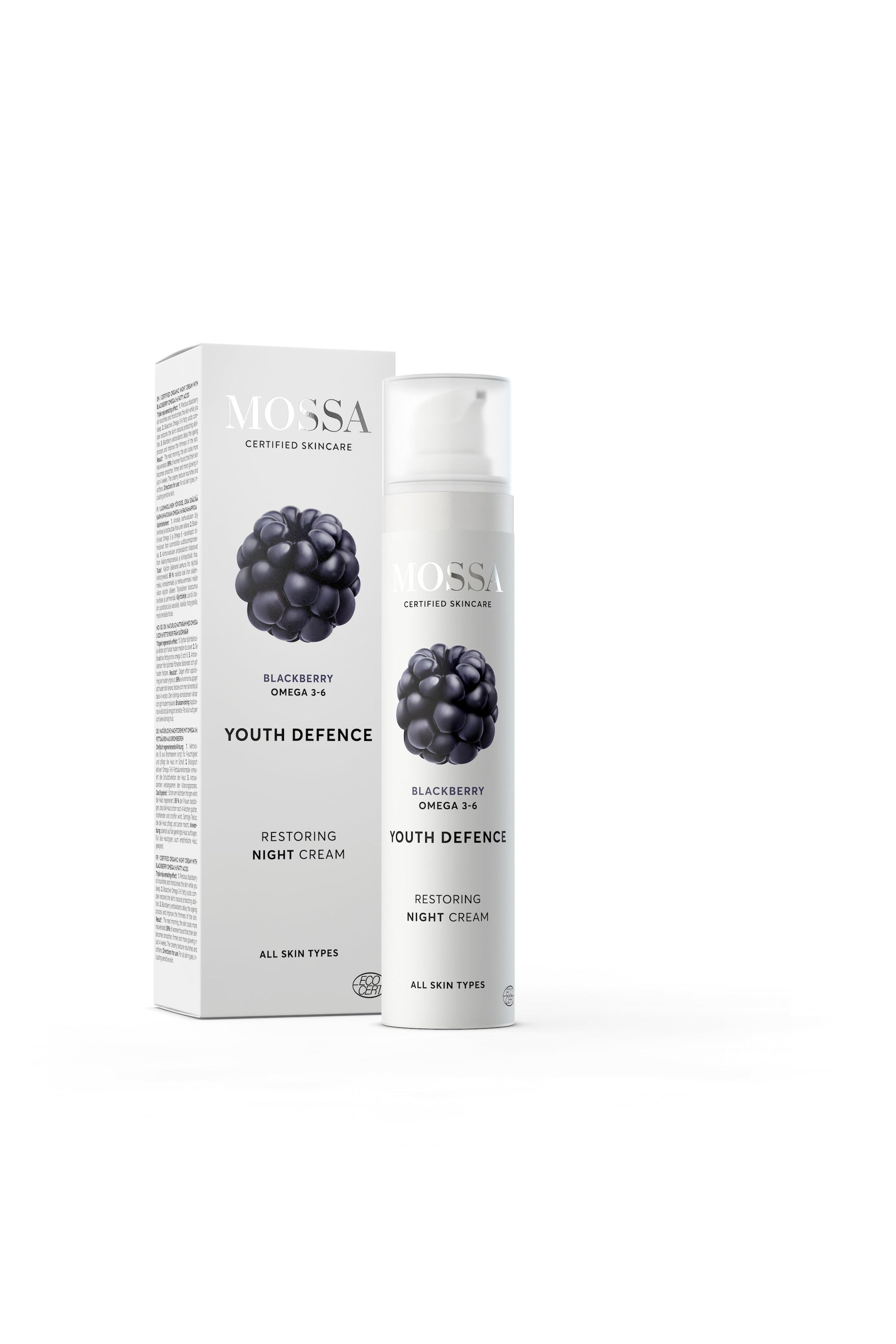 Die reichhaltige Textur der Brombeercreme Youth Defense von Mossa pflegt und macht die Haut nachts weich. Zu diesem Zeitpunkt repariert sich die Haut selbst und ist am aufnahmefähigsten für Nährstoffe. Deshalb muss eine Nachtcreme pflegender sein als eine Tagescreme, wenn die Haut immer mehr Schutz benötigt. Die Youth Defense-Reihe ist für die Haut im Alter von 20 bis 35 Jahren konzipiert und hat eine leichte Anti-Aging-Wirkung.